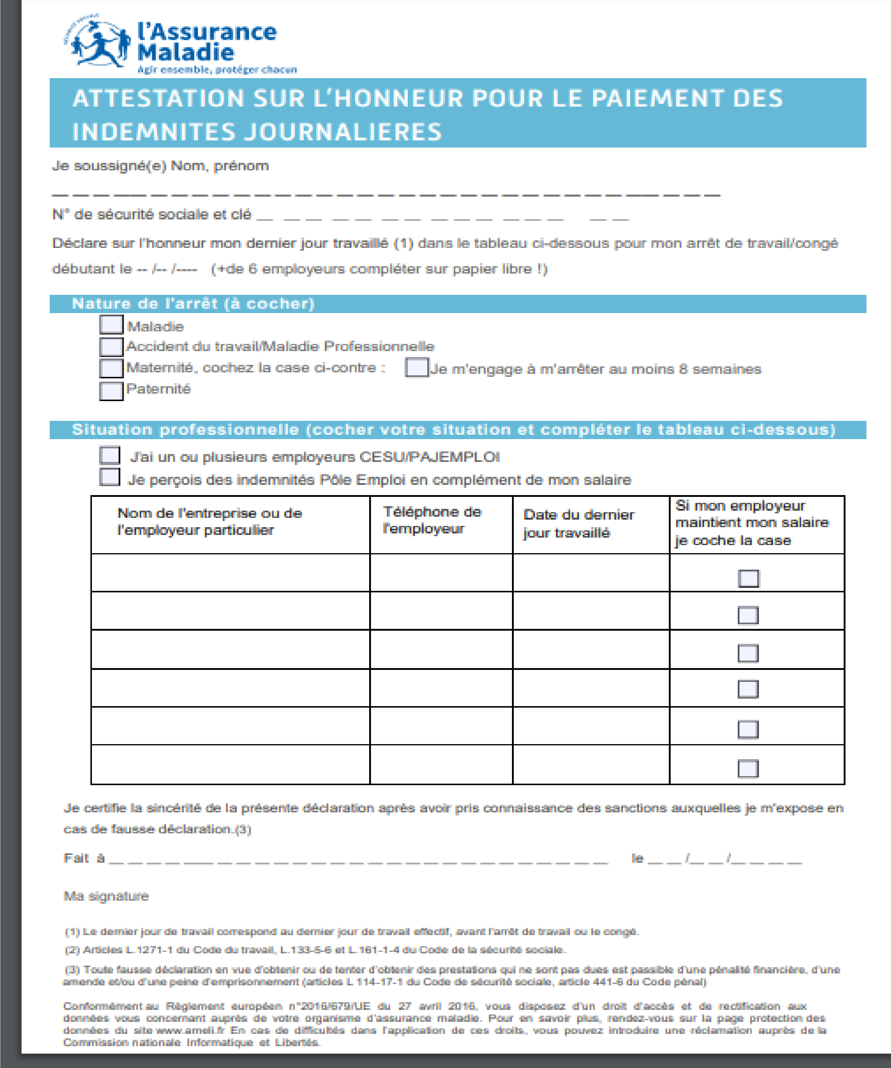 | Attestation sur l'honneur arrêt de travail (Mis le 24/01/2025) | Télécharger |